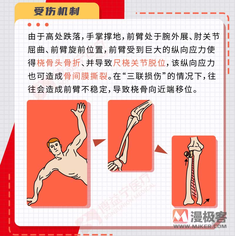 由于高处跌落,手掌撑地,前臂处于腕外展、肘关节屈曲、前臂旋前位置,前臂受到巨大的纵向应力使得桡骨头骨折、并导致尺桡关节脱位,该纵向应力也可造成骨间膜撕裂。在“三联损伤”的情况下,往往会造成前臂不稳定,导致桡骨向近端移位。